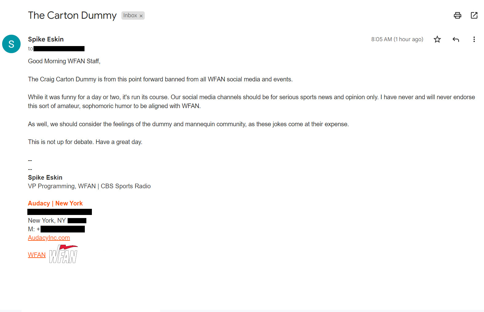 Wfan Sports Radio On Twitter Breaking Wfan Has Obtained An Official Email Confirming The Ban Of Cartondummywfan From All Wfan Activities The Dummy S Whereabouts Are Unknown At This Time He Is Yet